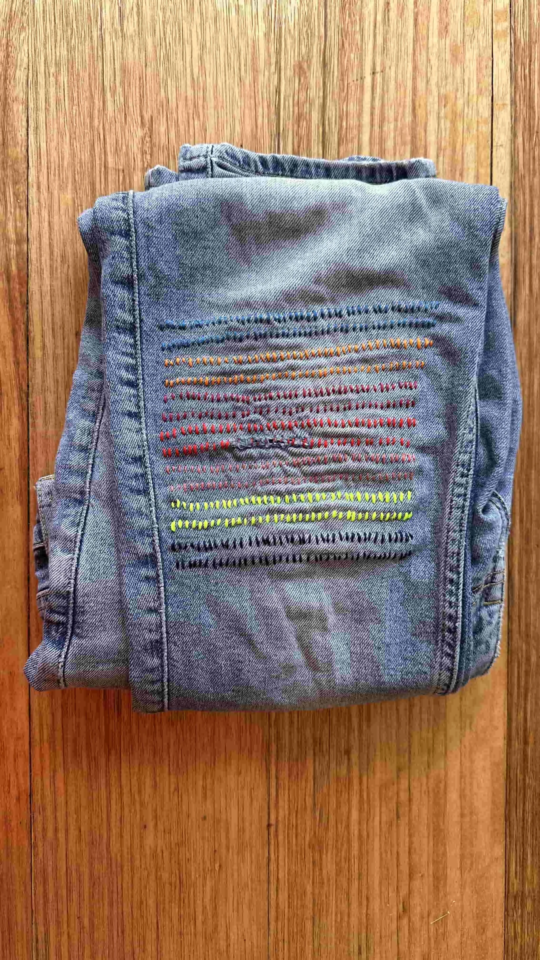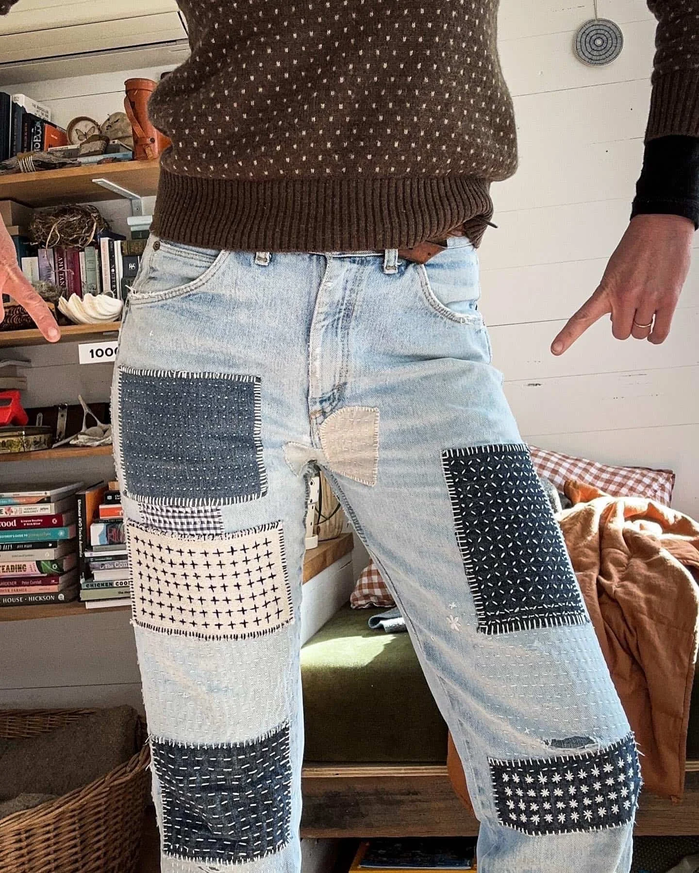 It’s all about repairing clothes using methods that embrace the repair as part of the garment’s story, rather than trying to hide it. Using colorful thread, creative stitching, or contrasting patches makes your mend stand out on purpose. It’s an act of rebellion against the toxic and wasteful fast fashion industry… and it’s fun.