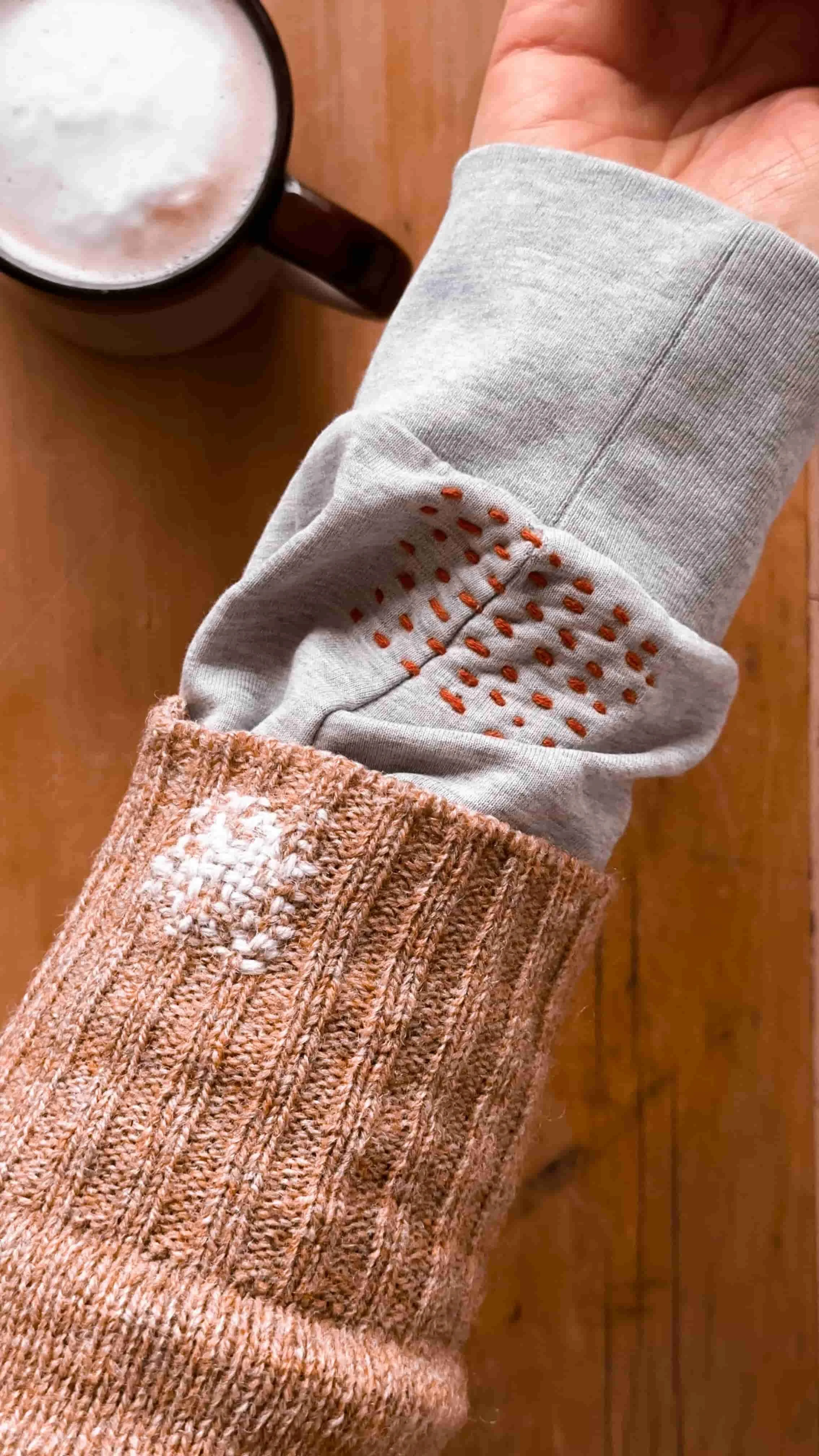 Darning, on the other hand, is like weaving a small thread patch right over the hole. It’s perfect for knitted things like socks, jumpers, and even polar fleece. It’s by far the most popular technique that folks are keen to learn at my workshops.